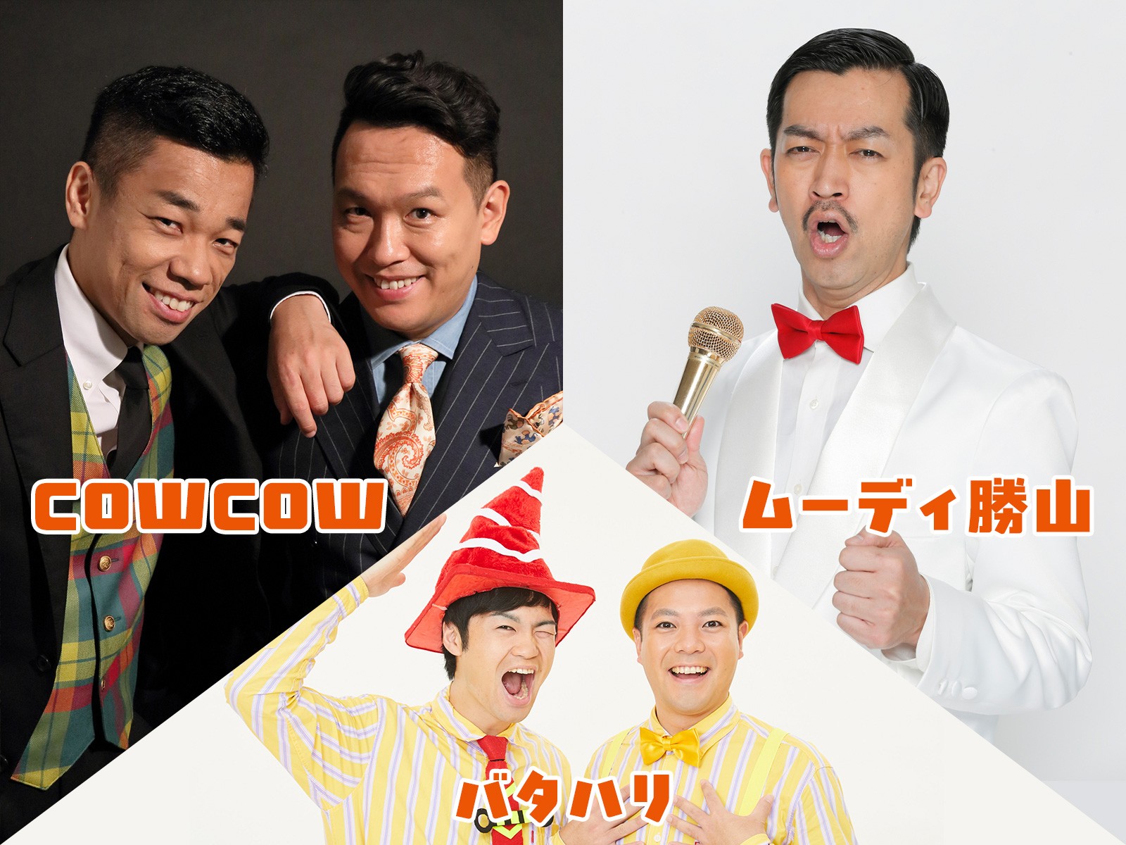 COWCOW、ムーディ勝山、バタハリによるお笑いステージを開催します。人気の音ネタや参加型コーナー企画をお楽しみいただけます。