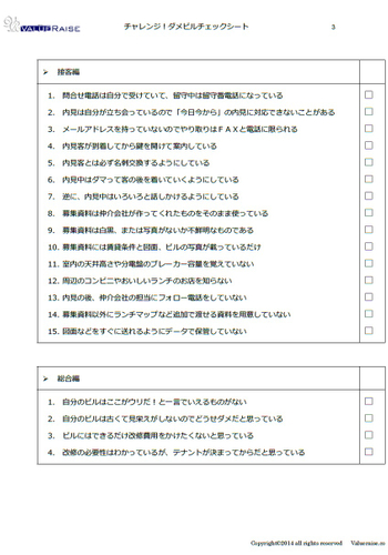 このチェックシート、見てお分かりの通りハード(建物)のことだけではなく、管理上のことや募集の仕方、接客方法についてなどソフトについてもかなりのチェック項目があります。