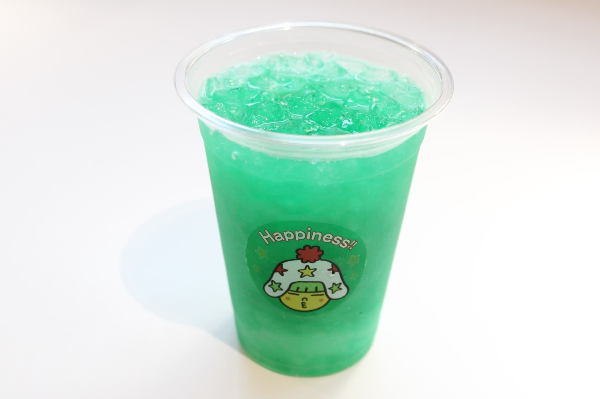 カップの中でキラキラと光を放つ不思議なドリンク「きらぷる♪メロンソーダ」は、まるでオーロラを閉じ込めたような輝き!