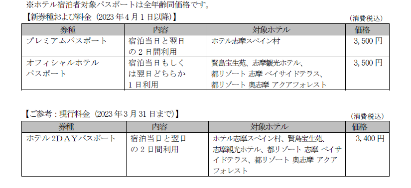 2023年4月1日(土)より、オフィシャルホテル宿泊者特典の「ホテル2DAYパスポート」を廃して、新たに、ホテル志摩スペイン村およびオフィシャルホテルご宿泊者を対象とした新券種を販売します。