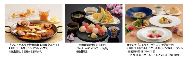 伊勢志摩の海の幸を使用したメニューや春らしいメニューが勢揃い。レストラン「アルハンブラ」では、南伊勢で養殖された高級魚クエを使ったパエリャ「シン・パエリャ伊勢志摩 幻の魚クエ~!」が登場。ジャパニーズレストラン「的矢」では、伊勢まだいとマグロを使った「手毬寿司定食」をお楽しみいただけます。さらにホテル志摩スペイン村でも、「春の祝祭」をテーマにした春らしい華やかなランチが登場します。