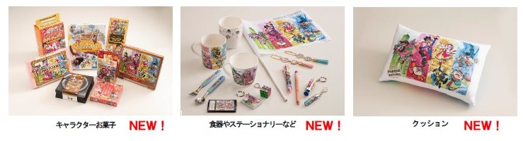 新デザインのキャラクターイラストを使ったグッズが登場します。お土産にぴったりのお菓子をはじめ、ご家庭や職場でも使えるマグカップ、手触りのいいクッションなどかわいいグッズが勢揃いです。