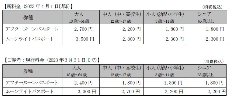 2023年4月1日(土)よりアフターヌーンパスポート、ムーンライトパスポートの料金改定を行います。