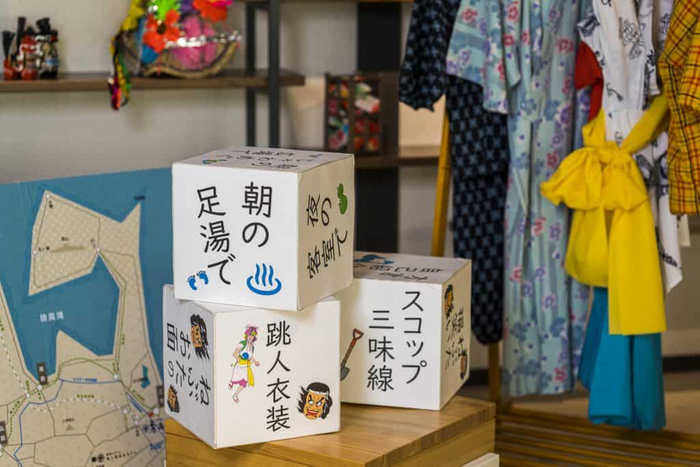 本プランでは、サイコロを振って宿での過ごし方を決めます。サイコロは3つあります。いつどこで体験をするかを決める「いづどご」、何を着て体験するかを決める「何着るべか」、そして体験する内容を決める「何すっか」です。それぞれのサイコロを、運に任せて時間と場所、服装、体験内容を決めます。組み合わせは216通りで、ばんくらへ(予想外)な滞在を楽しむことができます。