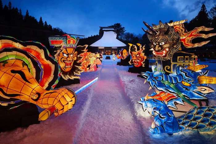 冬期間限定で、通常は夏にしか見られない色鮮やかなねぶたを、真っ白い雪景色の中に展示する「ねぶた雪灯り」を実施します。4人のねぶた師が手がけた作品が展示されており、ねぶたごとに異なる造形や色遣いなどの特徴の違いを楽しむことができます。
