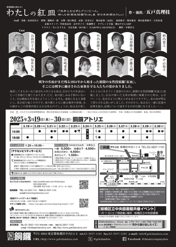 劇団銅鑼主催、『わたしの紅皿』が2025年3月19日 (水) 〜 2025年3月30日 (日)に銅鑼アトリエ(東京都 板橋区 中台 1-1-4)にて上演されます。 チケットはカンフェティ(運営:ロングランプランニング株式会社、東京都新宿区、代表取締役:榑松 大剛)にて発売中です。