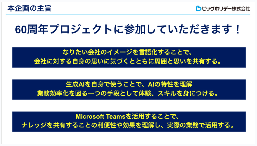 ビッグホリデー株式会社(本社:東京都文京区、代表取締役社長:岩崎 安利)は、2024年4月1日に創業60周年を迎えるにあたり、社内公募により記念ロゴマークのデザイン案を決定したことをお知らせいたします。60周年プロジェクトの一環として企画された記念ロゴマークの社内公募は、社員それぞれが生成AI(Microsoft Copilot)を活用し、会社への思いを可視化しました。社内投票で決定したデザイン案は、お客様やパートナー販売店、提携企業への「感謝の気持ち」と100年企業を目指す「変革」の思いが表現されています。このデザイン案はロゴマーク化され、2024年度の1年間、当社の広報や広告活動、各種営業ツールなどで利用されます。