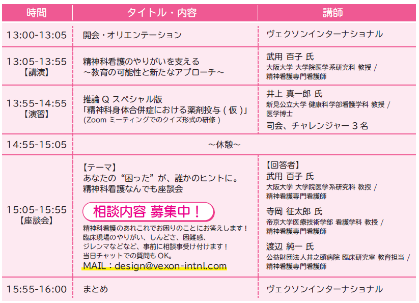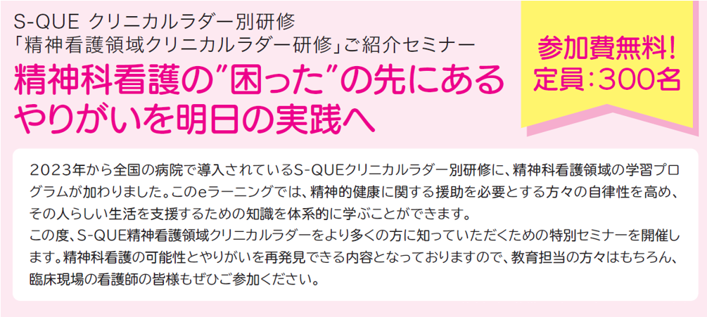 S-QUEクリニカルラダー別研修の有料オプションとしてご利用いただけます **「精神看護領域クリニカルラダー研修」** をより多くの方に知っていただくための特別セミナーを開催いたします。