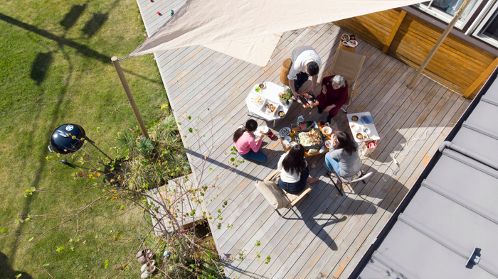 本社にある空き地をリノベーションして、持続可能な森林を支える国産材の「スギ」を使用した塀や「ひのき」の幅広いデッキ配置。広い芝の上やデッキを利用したヨガ、ピラテス、太極拳、アーシングなどのセッションに利用できます。