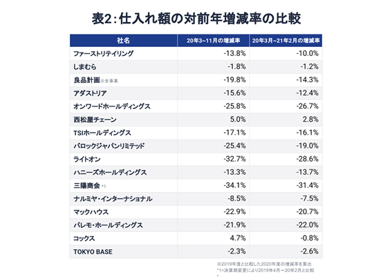 表2は2020年3~11月と20年3月~21年2月の期中仕入れ額のそれぞれの対前年増減率を比較したものだ。