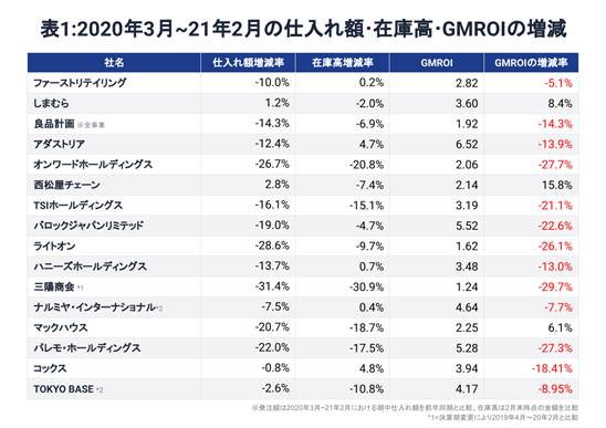 本稿の調査対象は2月期・5月期・8月期決算の主要なアパレル企業16社の2020年3月から21年2月までの1年間における決算。決算短信を基に、前年と比較した期中仕入れ(発注)と2月末の在庫高、GMROIの増減率を計算したのが表1だ。