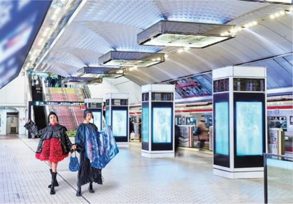 大阪モード学園では、今年度の卒業制作展、未来創造展2023において「MAKE NEWS 世界が振り向く衝動を。」(※3)をコンセプトテーマに、各学科がさまざまなクリエイションに取り組んできました。その中で今回、ファッションデザイン学科高度専門士コース・ファッションデザイン学科・ファッション技術学科の4年生全12グループが創造したファッションと彼らが切り取った梅田をコラボレーションさせ、新たな梅田の発見や魅力を12のシーンに表現し発信していくことに挑戦しました。また、Osaka Metro梅田駅の今昔を、見る角度によって絵が変わるレンチキュラー印刷技術を使ったスペシャルなコーナーで体験いただけます。
