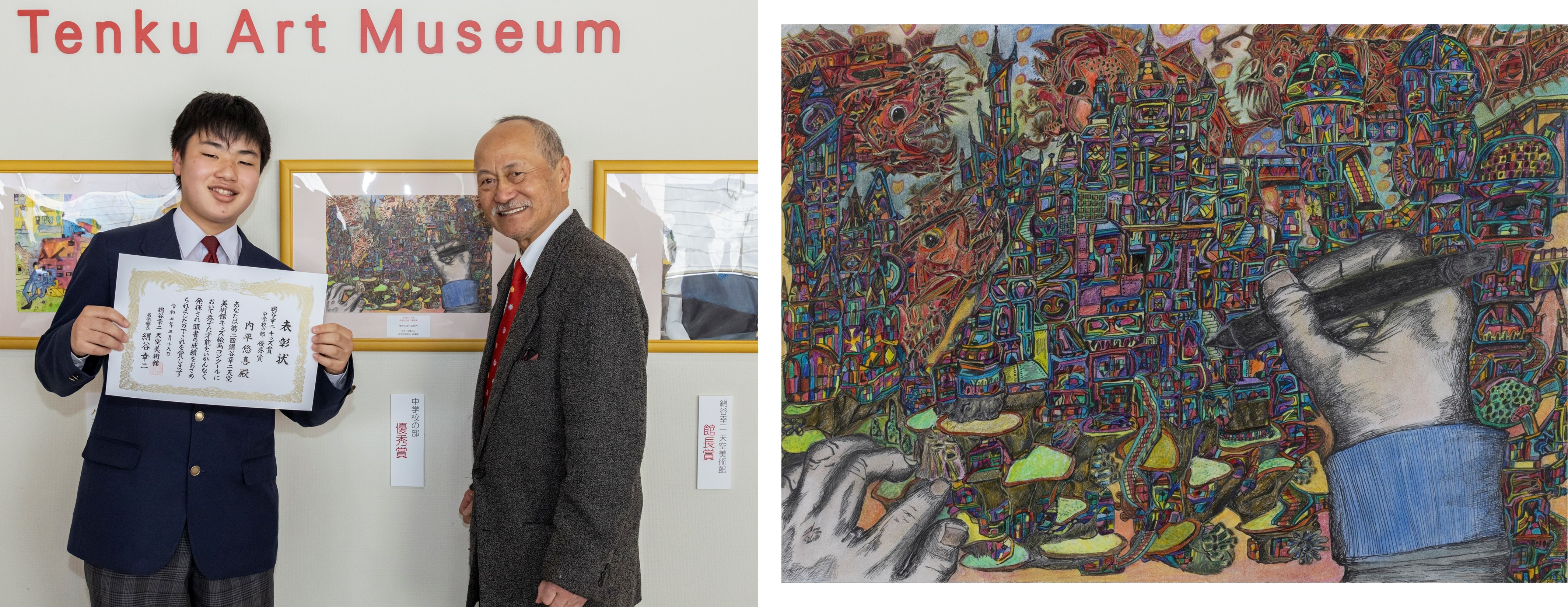 審査委員長は「絹谷幸二 天空美術館」の名誉館長であり、2021年度の文化勲章受章画家の絹谷幸二氏が務め、応募期間に集まった全国の小中学生による1,796点の中から、絹谷幸二キッズ賞 グランプリ(1名)、部門優秀賞(各1名)、館長賞(1名)、佳作賞(43名)、入選(67名)の計115点、そして特別賞として来年度から正式に設ける団体賞(11団体)を決定しました。