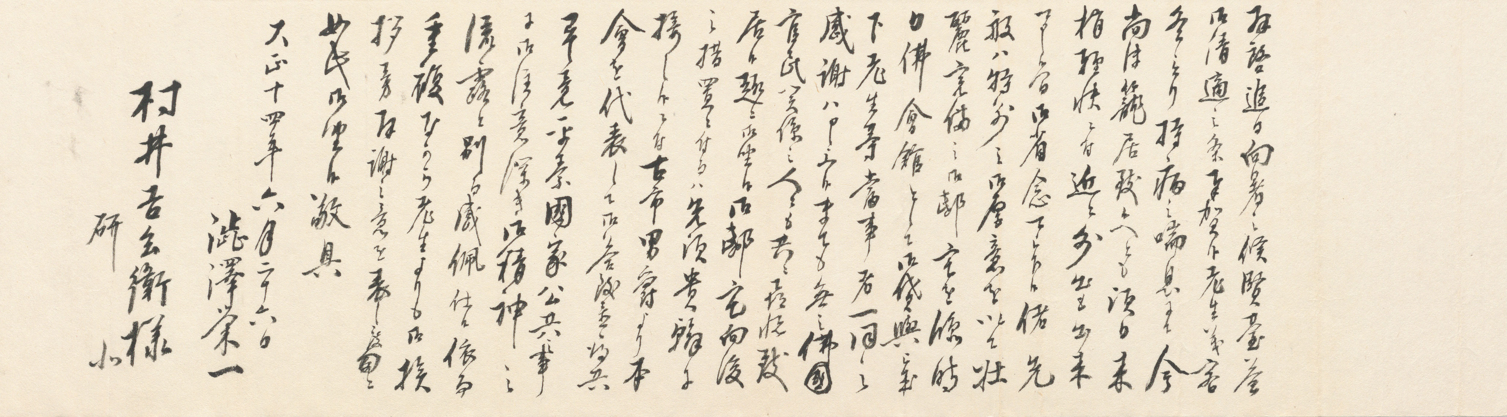 吉兵衛が自身の邸宅である山王荘洋館を日仏会館として貸与したことへの礼状。書簡の中で渋沢は、日頃から「国家公共」のことに深く意を用いている吉兵衛の精神が表れた行いだと、高く評価している。吉兵衛は、村井銀行を設立して以来、渋沢と親交を深めていった。