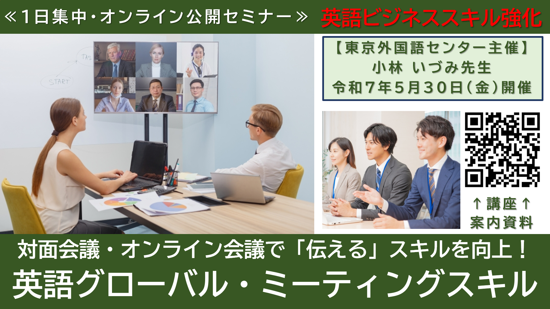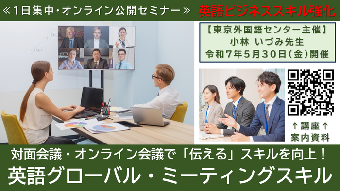 東京外国語センターは、公開講座「英語グローバル・ミーティングスキル」セミナーをオンラインで開催します。