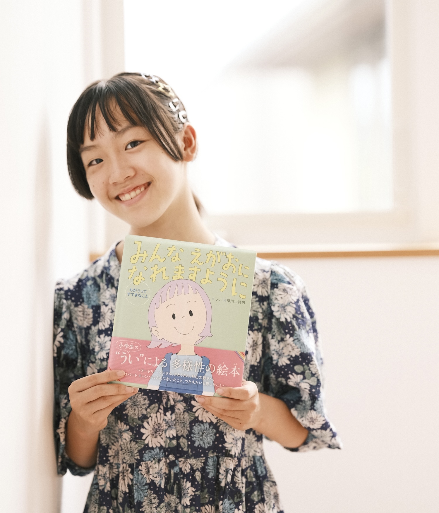 また2019年、小学校3年生の時にテレビをきっかけにトランスジェンダーの当事者の方にインタビューをし、小冊子「小学生の私たちが知っているだけで、せかいをかえることができる」を自費出版。その後、ういは台湾の当時のデジタル担当大臣・オードリー・タン氏や日本文学研究者ロバート キャンベル氏と対談をし、それをまとめた絵本「みんなえがおになれますように」をGakkenから出版。発売前に増刷される異例の絵本出版として話題になりました。