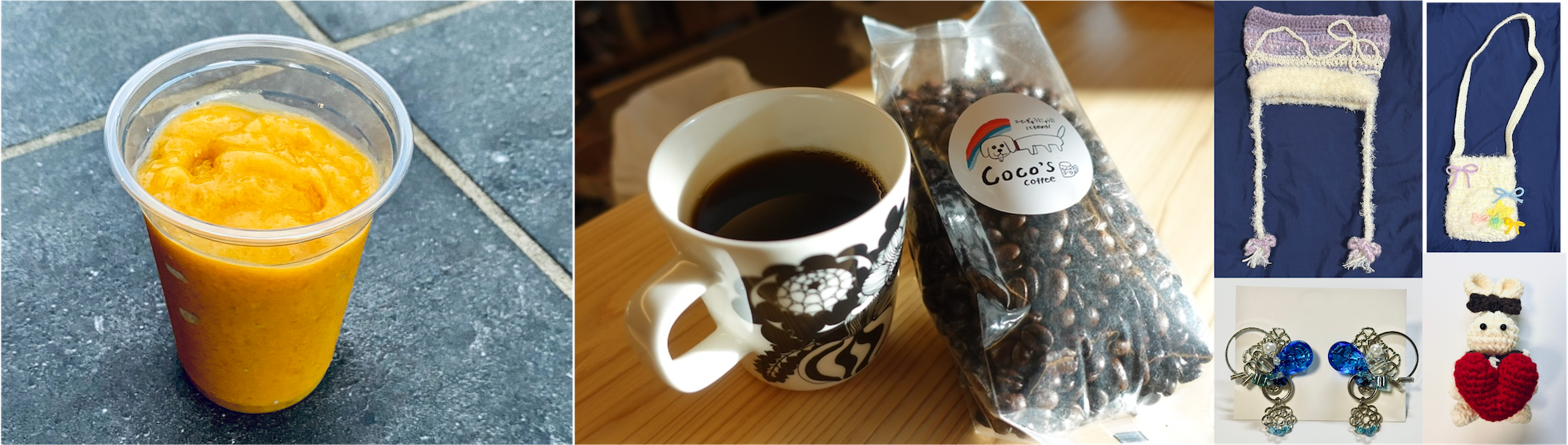 内容:ハンドメイドのアクセサリー、編み物のバッグやぬいぐるみなど