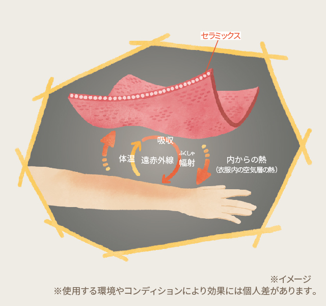 身体から放射された遠赤外線を吸収し輻射することによって、温もりを保ち血行を促進します。