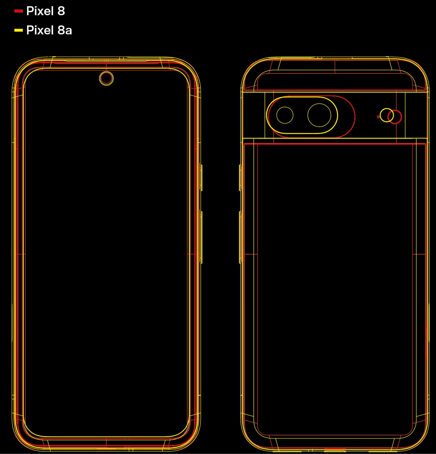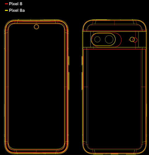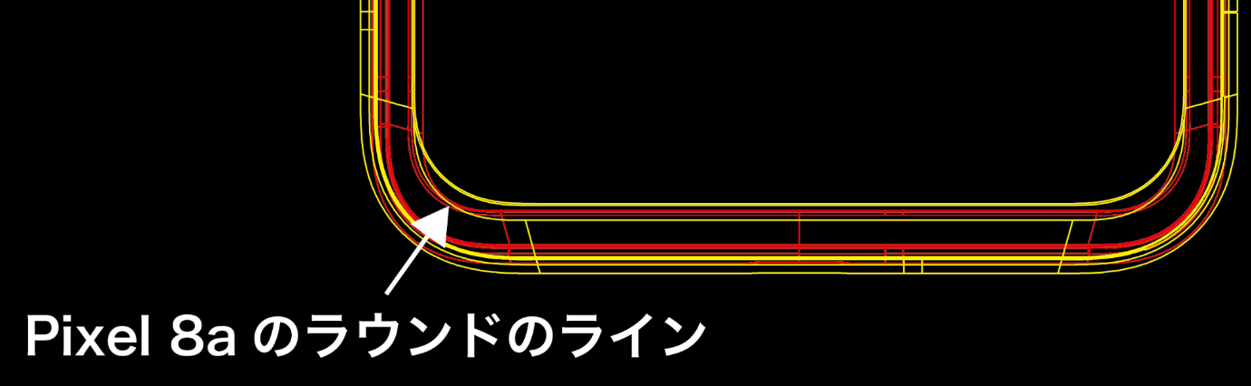 黄線がPixel 8a、赤線がPixel 8の端末の図面です。重ねて形状を比較します。