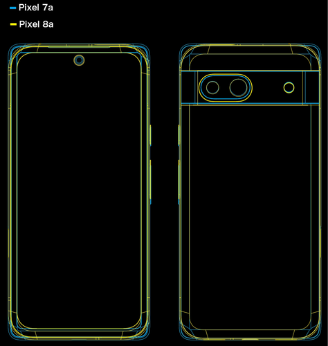 黄線がPixel 8a、青線がPixel 7aの端末の図面です。重ねて形状を比較します。
