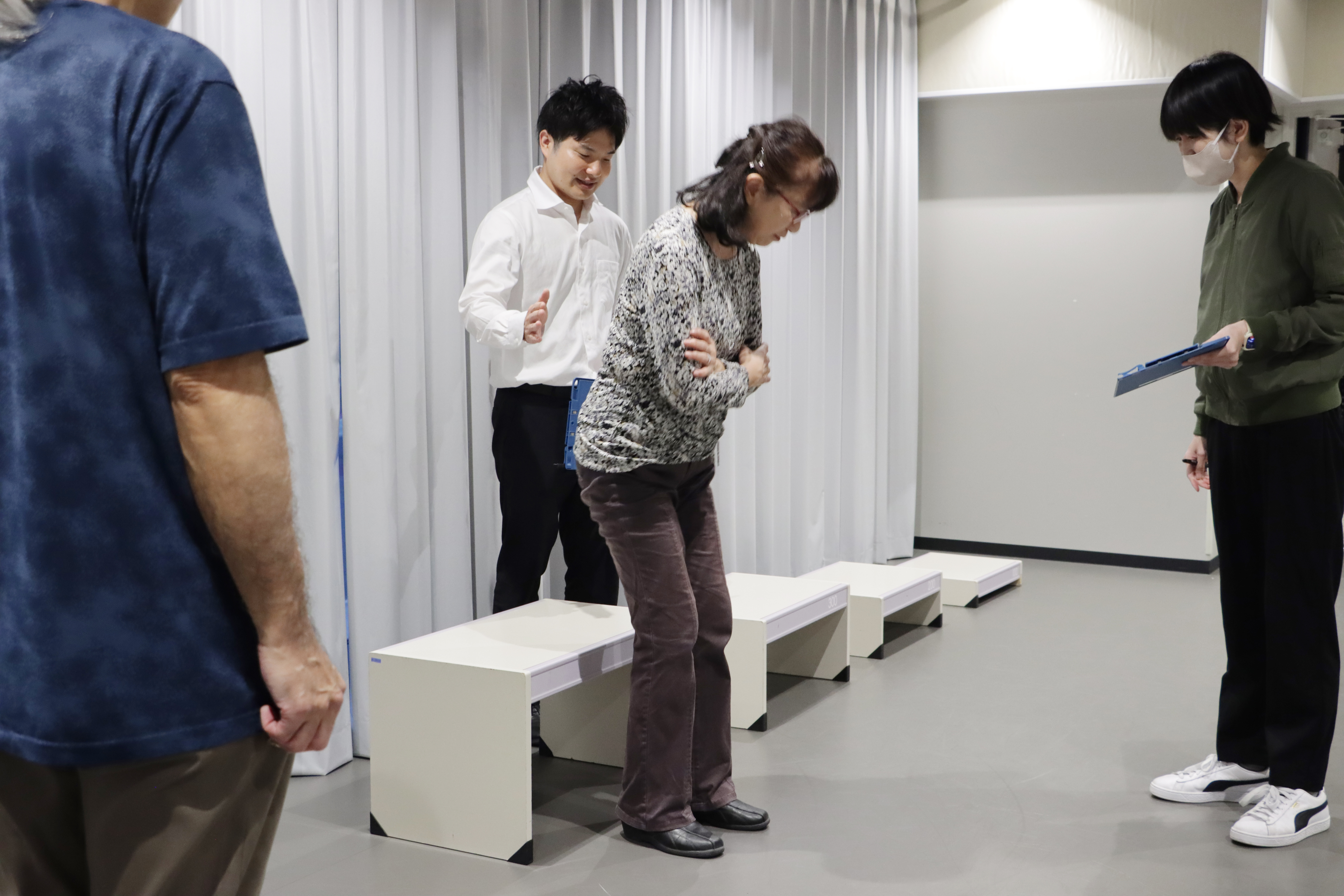 3時間の体験会には21名が参加し、立ち上がりテスト・ステップテスト・握力テストによる「体力年齢測定(ロコモチェック)」も実施。参加者は「こんなに動かしづらいとは思わなかった」「段差がこんなに怖いのは初めて」と感想を述べ、理学療法士との対話を通じて、身体の構造や補助の方法を学びました。