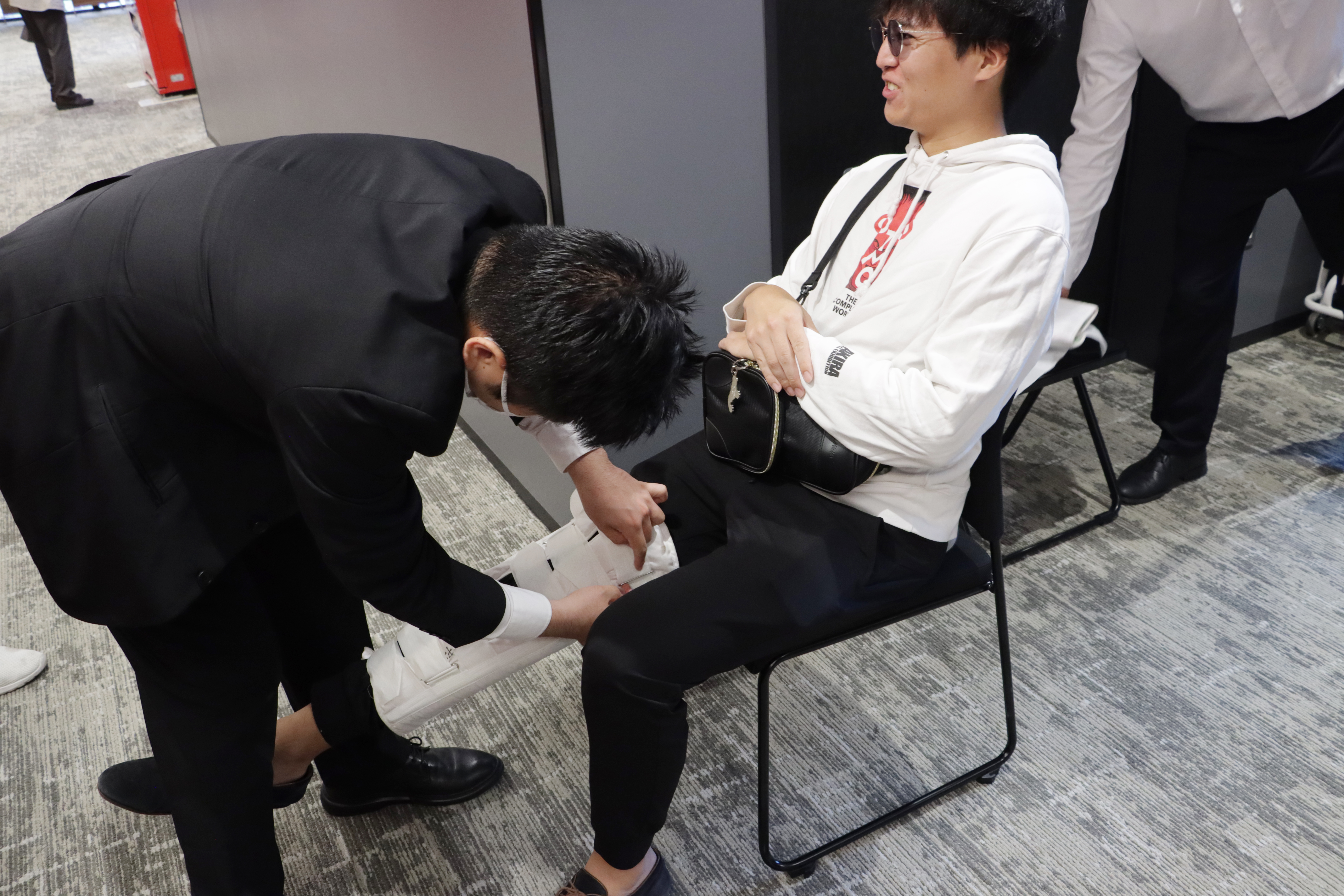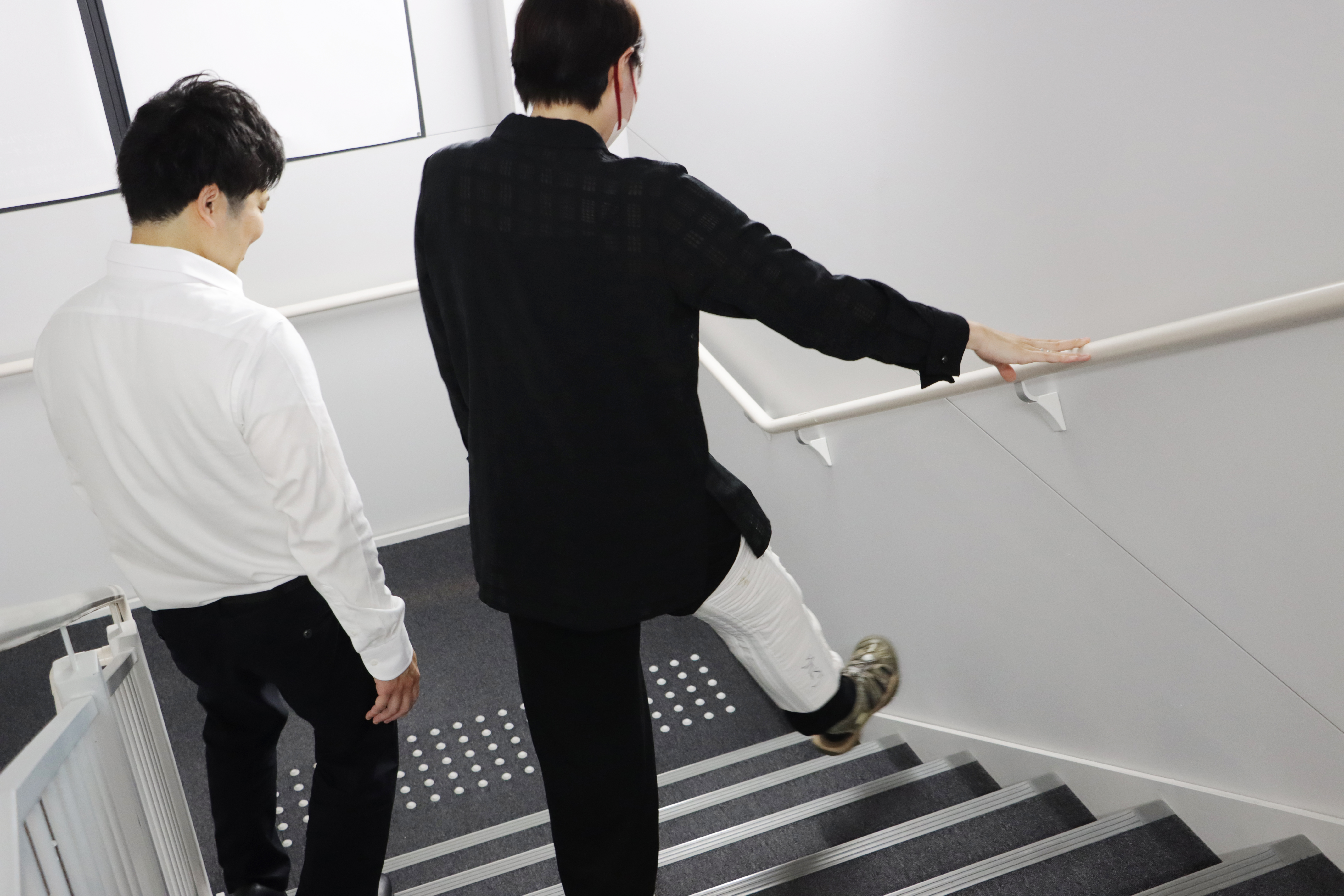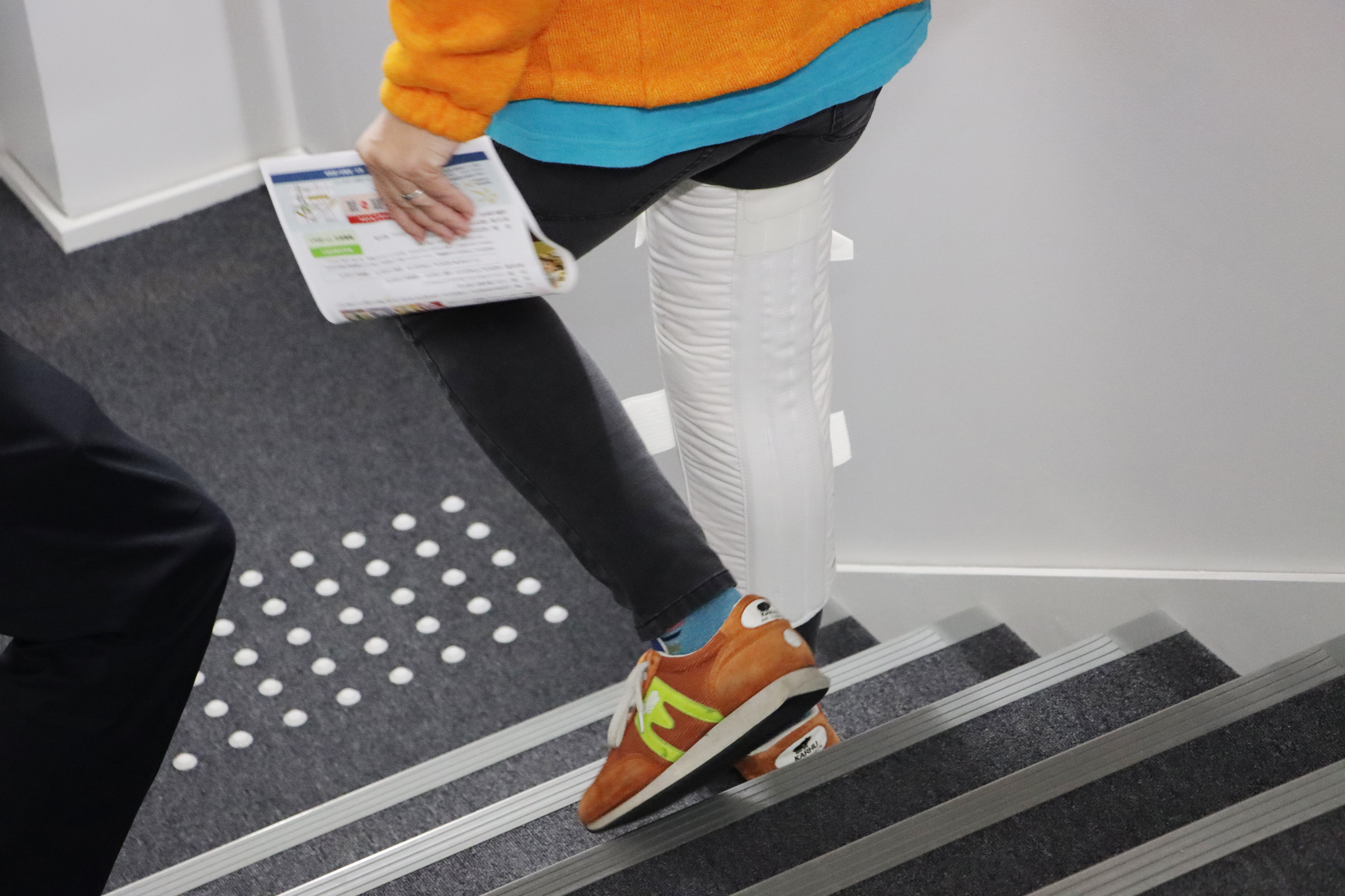 10月26日(日)、天満音楽祭の会場でもある扇町ミュージアムキューブにて開催されたこのイベントでは、「階段が壁になる?普通がこんなに難しい体験」をテーマに、ニーブレース(膝の動きを制限する装具)を用いて「足が伸びない・曲がらない」状態を再現。参加者はその状態で階段を昇り降りしながら、片足が使いづらい中でどう体を動かせばよいかを模索しました。