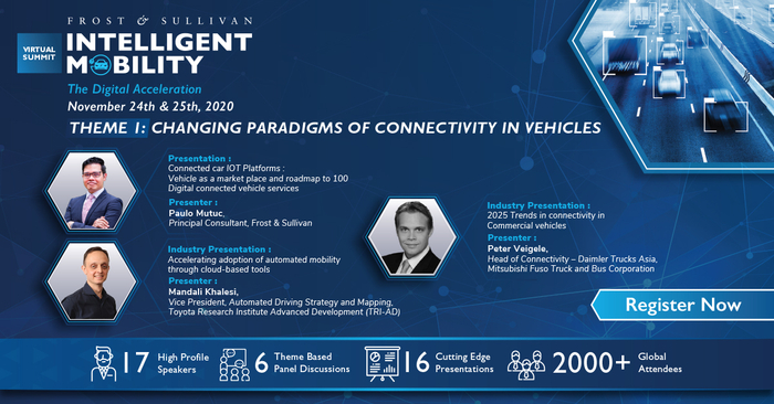 デジタル化がどのようにモビリティ市場を進化させているかを理解することを目的とし、フロスト・アンド・サリバンは今年Intelligent Mobility Summit 2020のテーマを、「インテリジェントモビリティ:加速するデジタル化」としました。2020年11月24、25日の2日間に開催されるこのオンラインサミットでは、特にアジア太平洋地域の業界関係者が、ポストコロナのシナリオにおいて、ニューノーマルを理解し、モビリティの未来を形作るために役立つデジタルテクノロジーの未来について、独自の洞察を提供します。