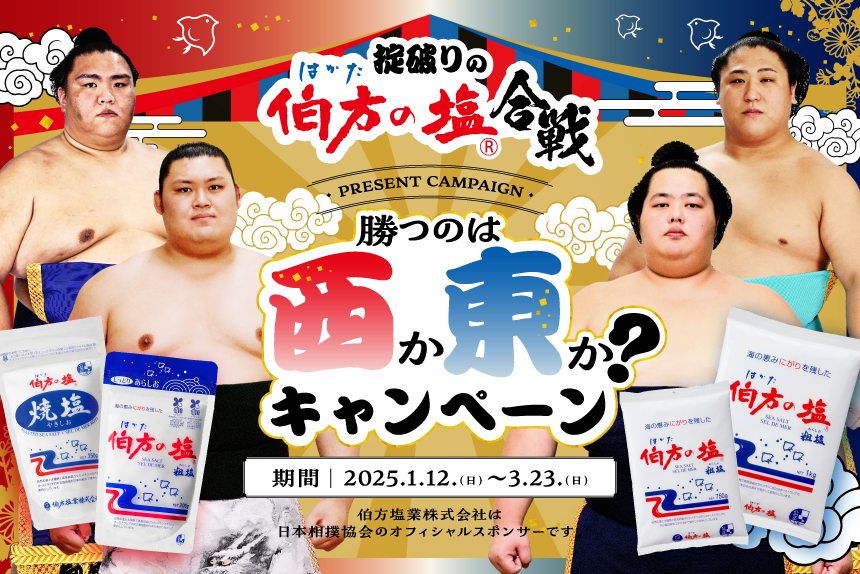 伯方塩業株式会社(本社:愛媛県松山市、代表取締役社長:石丸 一三)は、2025年1月12日(日)から3月23日(日)までの期間、日本相撲協会とコラボしたプレゼントキャンペーンを開催いたします。本キャンペーンでは、専用サイトから対象商品をご購入のレシートでご応募いただくと、抽選で合計100名様に、大相撲×伯方の塩コラボオリジナルデザインのQUOカードが当たります。