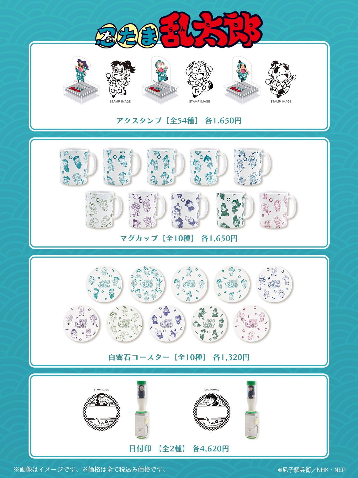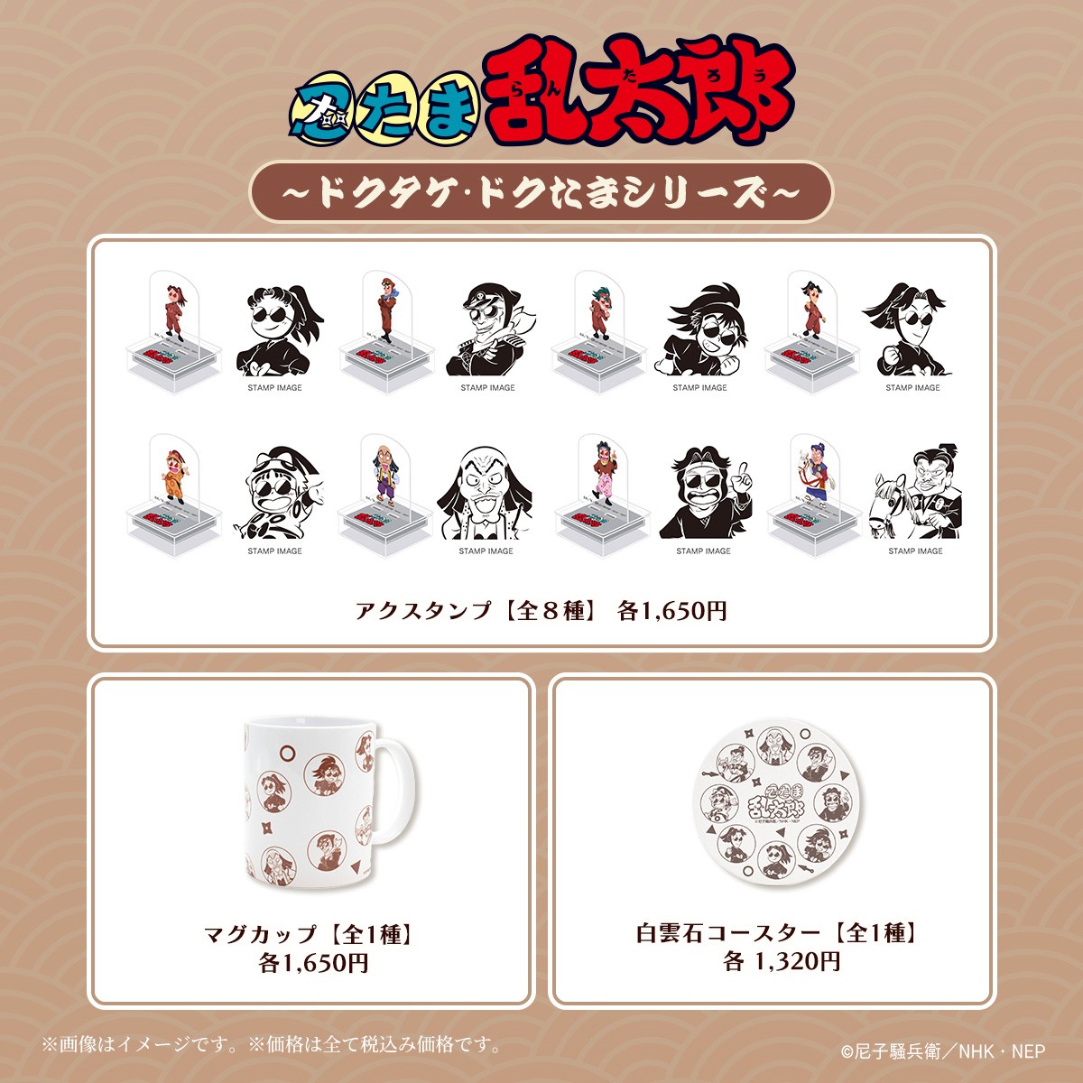 さらに今回のグッズ企画では、「ドクタケ・ドクたまシリーズ」としておなじみのキャラクターがアクスタンプ・白雲石コースター・マグカップとなって登場します。グッズの一覧は以下の通りです。