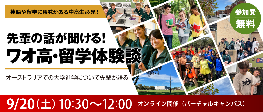 教養探究で哲学・科学・経済を学べる通信制高校・学校法人ワオ未来学園ワオ高等学校(本校所在地:岡山県岡山市、校長:平田強)は、9月~12月に月1回、「先輩の話が聞ける!ワオ高・留学体験談」をオンラインで開催いたします。ワオ高校グローバルコースは、オーストラリアへの長期高校留学やアメリカ・マレーシアなどの海外大学進学を目指すコースで、毎年多数の実績を挙げており、今回のイベントでは現在留学中の生徒や卒業生、これから留学に向かう生徒のリアルな話を聞くことができます。初回開催は9月20日(土)10:30~12:00です。
