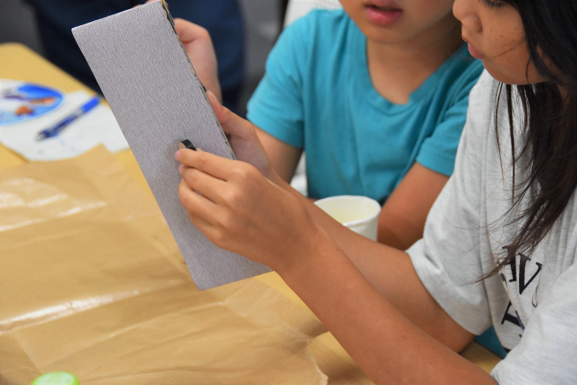 対戦終了後には、駒の製作体験も行われ、駒の角をやすりで削る面取りと黒のマジックペンでの色塗りを行いました。