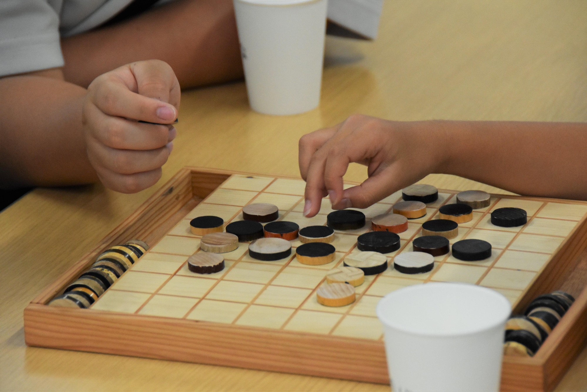 中日青葉学園の小・中・高校の児童と生徒が2~3人でチームを組み、大学生、名古屋聾学校の生徒も加わり、大会がスタート。対戦が始まると皆ボードに集中し、小学生が専攻科生を負かす対戦もみられ、各テーブルで白熱したゲームが展開されました。3回の対戦の勝ち数と、獲得した駒数で総合優勝とポイント賞が決定し、木製の表彰状が贈られました。