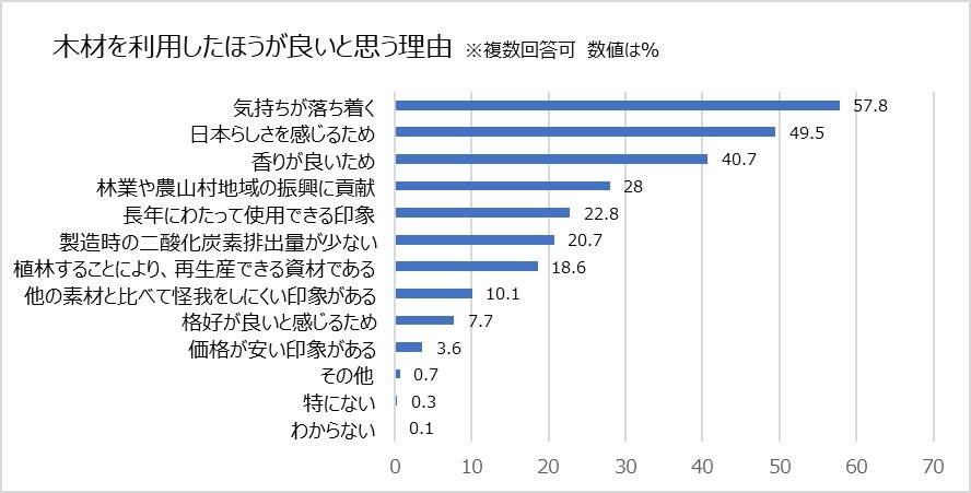 また、内閣府の調査でも、建物や製品に木材を使った方が良いと考える人は約9割にも上っており、その理由として最も多かったのは「気分が落ち着く」が約6割※2。多くの人が木や木材に心地よいイメージを持っているようです。