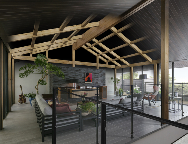 「シャーウッドは、屋根の勾配が生み出す天井高と、広々とした豊かな空間が特長です。『KOKAGE LOUNGE』では、それをさらに進化させ、56m2(約34畳)が限界だった柱の無い勾配屋根の吹き抜け空間を、約1.4倍の80m2(約48畳)に拡大しました。水平方向だけでなく垂直方向への空間の広がりを加えることで、そこに住む方同士の新たなつながりも生まれます。」