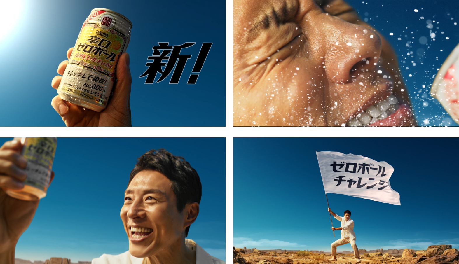 「辛口ゼロボール」”を飲み、そのおいしさを噛み締める表情や、「ゼロボールチャレンジ」を促す大きな旗を振りながら視聴者にもチャレンジを呼びかけるシーンにご注目ください。