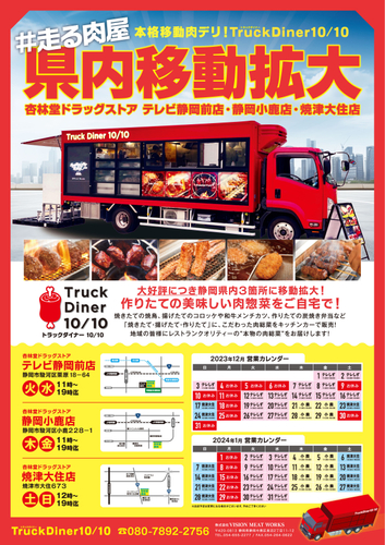 株式会社VISION MEAT WORKSは、2023年7月1日に「TruckDiner10/10(トラックダイナージュージュー)杏林堂薬局テレビ静岡前店」で活動をスタートいたしました。静岡を拠点とする食肉の輸入生産加工卸商社として60余年にわたり培ってきたノウハウを生かし、お手ごろなお値段で本格的な肉料理とお惣菜、お弁当をご提供する新しいタイプの「フードトラック型の走る肉屋」です。おかげさまでご好評をいただき、この度、活動拠点を拡大し、「杏林堂薬局静岡小鹿店」「杏林堂薬局焼津大住店」へ出店を開始いたします。