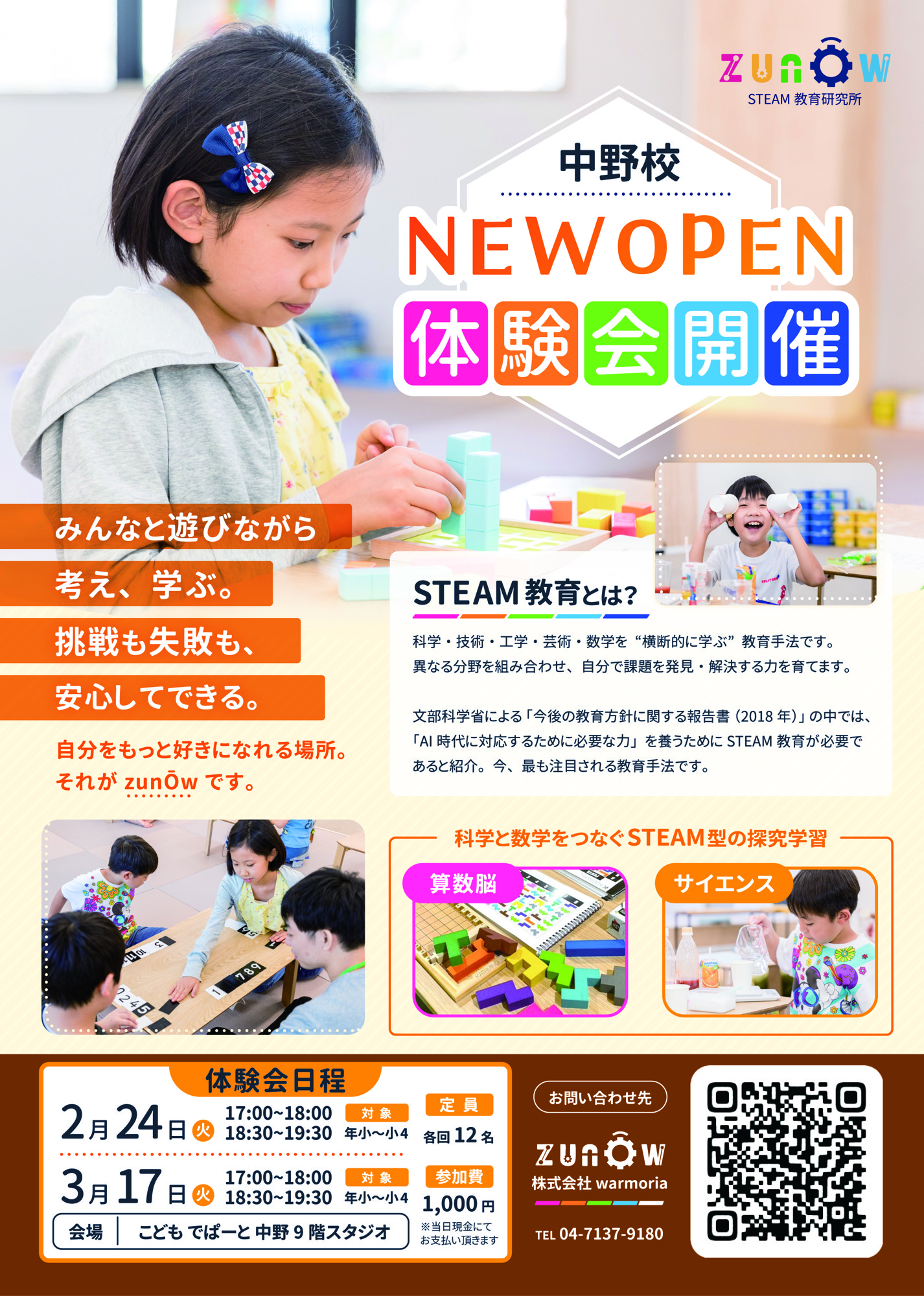 株式会社warmoria(本社:千葉県流山市おおたかの森東4丁目1-6、代表:平野智史)は、教育・音楽・落語を融合した新発信プロジェクト「まなびと頭脳」を開始いたします。同時に、次世代型STEAM教室「zunŌw」が都内展開を本格化し、2026年4月に中野駅前で新規開校いたします。2026年2月より体験会の開催も決定し、池袋校もリニューアルオープンいたします。より多くの家庭へSTEAM教育を届けてまいります。