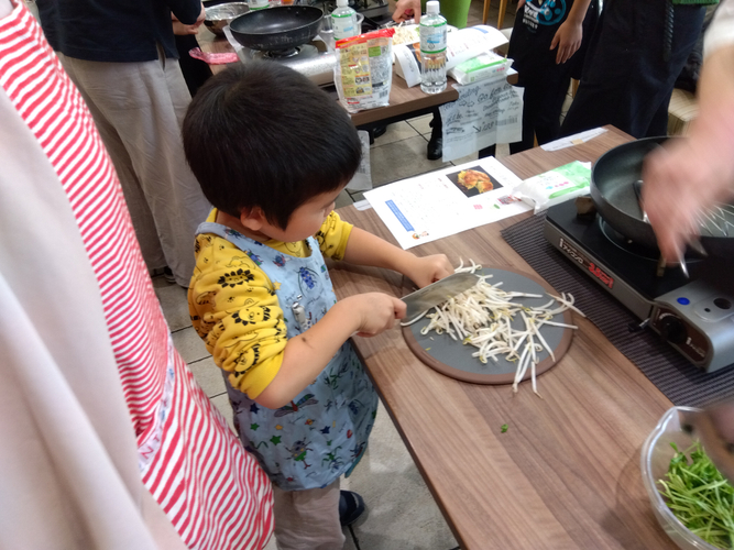 日清製粉ウェルナからは、冷蔵庫の中で余りがちなもやしや豆苗を使った、エコのみ焼き(お好み焼き)の料理教室を行いました。