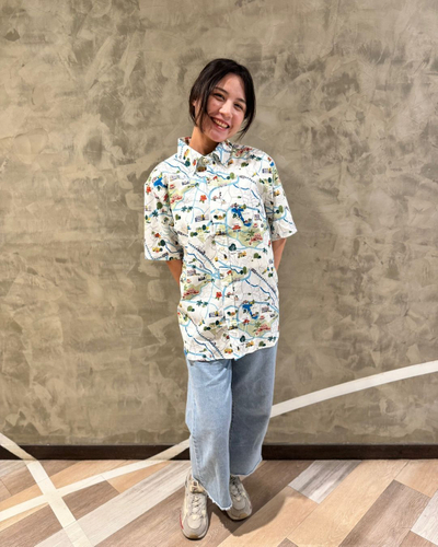 那覇市首里界隈を地図タッチで描いたユニークなデザイン。首里を散歩すると目に飛び込んでくる建物や乗り物をモチーフに、着ても・見ても・楽しい柄に仕上げた一枚です。メンズアイテムですが男女を問わずユニセックスに着こなしていただけます。