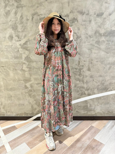 熱帯のヤシの木や優美なシダが織りなす熱帯雨林を表現したリバティプリント「アデルフィ・ヴォヤージュ」にさりげなく沖縄の要素をプラスした、リゾートにぴったりなエスニックテイストのワンピースです。