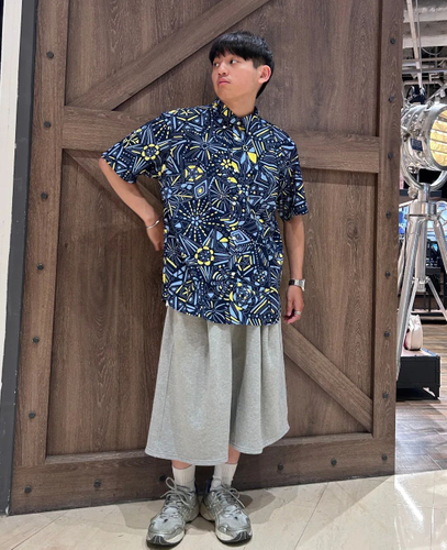 ビーチでさまざまなアクティビティを楽しんでいるシーンを切り取って楽しい雰囲気のデザインに。ビビットな色合いとゆるめなタッチのイラストに遊び心がくすぐられる一枚です。メンズアイテムですが女性もざっくり羽織ってキュートな着こなしに。