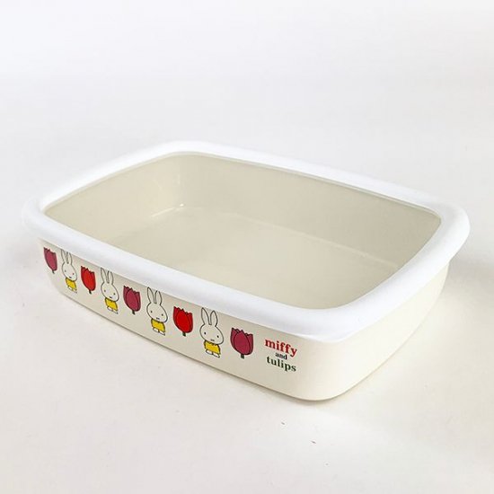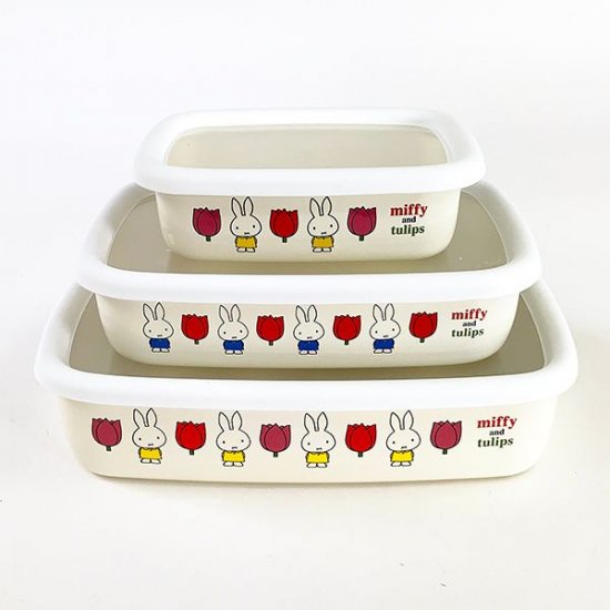 こちらは、フタつきのホーロー製ストッカーです。サイドにミッフィーとチューリップがデザインされていて、サイズは3種類。画像のアイテムは、一番小さなSサイズで、10.5×14.5×4cmです。