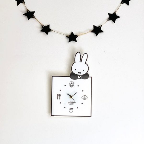 モノクロのかわいいミッフィーのインテリアクロックです。シンプルなデザインなので、どんなお部屋にも。大きめのサイズなのでお部屋のアクセントにもなりますし、キュートなミッフィーに心が癒されます…時計の部分はお花が12時、ケーキがおやつの時間をイメージして3時、りんごが6時、フォークとナイフがごはんの時間をイメージして9時になっているのでお子様と一緒に時間のお勉強にも。パーフェクトワールドトーキョーが、大好きなミッフィを心を込めてアレンジした時計です。場所、年齢を選ばないデザインなので、プレゼントや贈り物にも喜んでいただけると嬉しいです。
