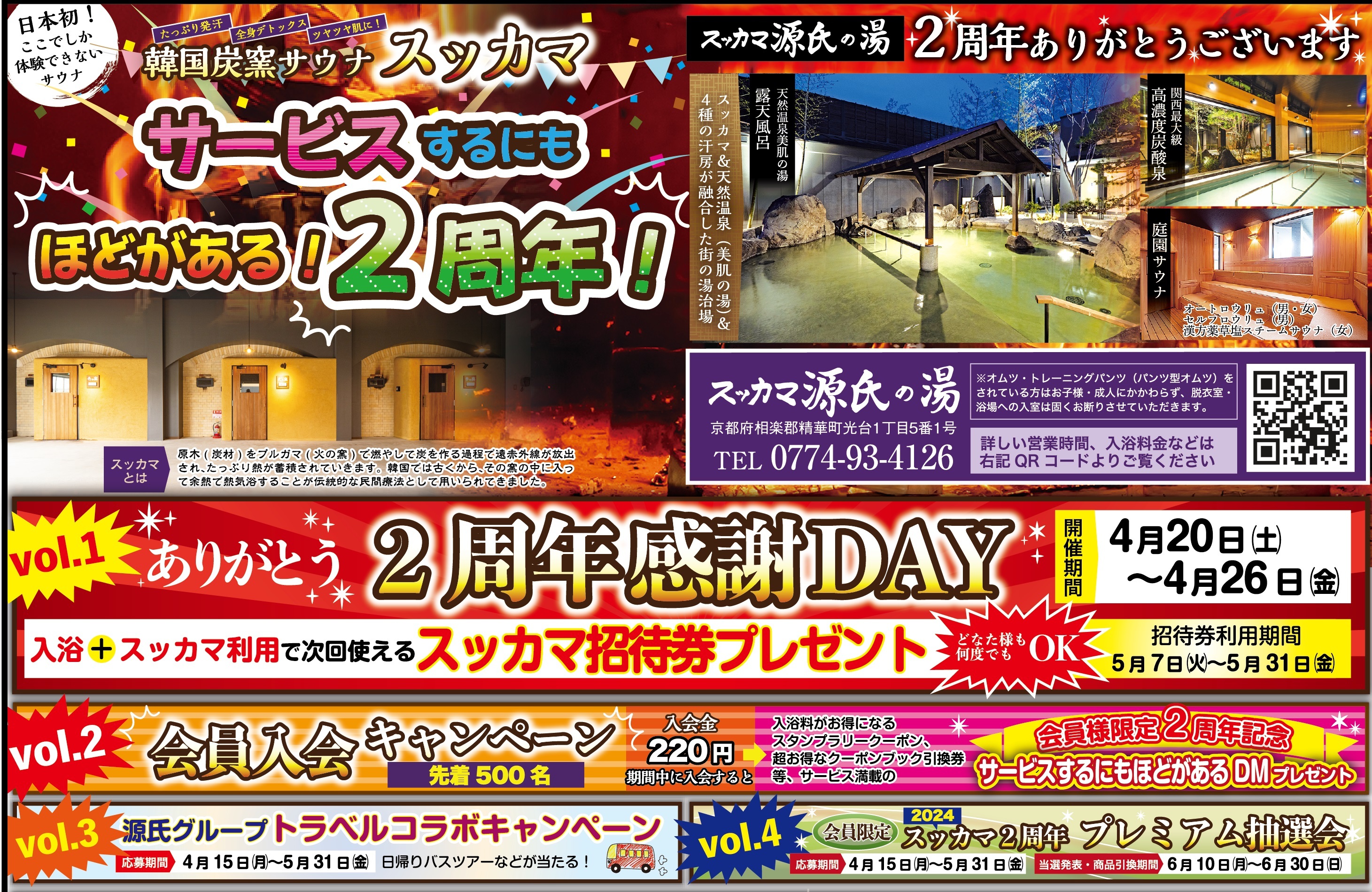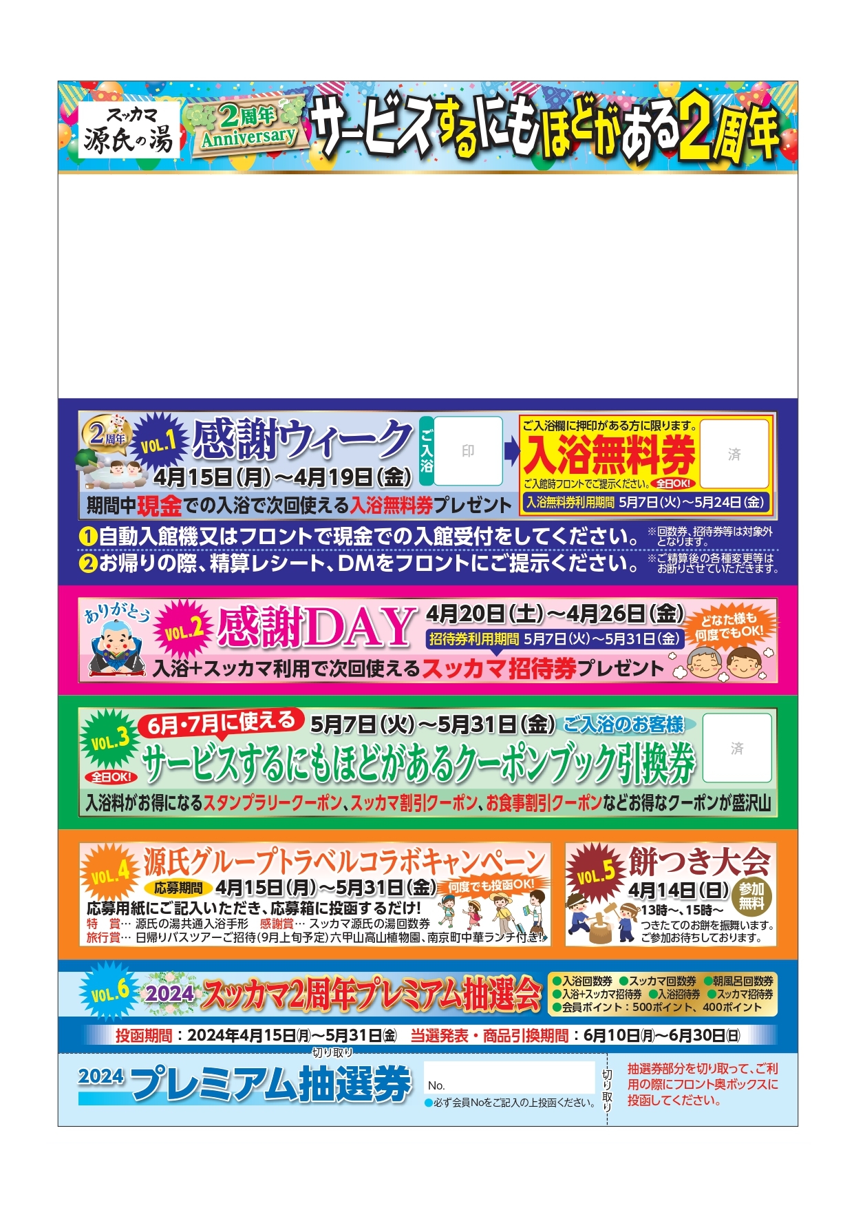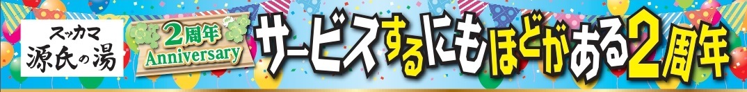 オープン2周年を記念し、地元の皆様・スッカマ源氏の湯会員様に感謝の気持ちを込めイベント『サービスするにもほどがある2周年』を、2024年4月1日(月)から5月31日(金)までの2ケ月間に開催いたします。