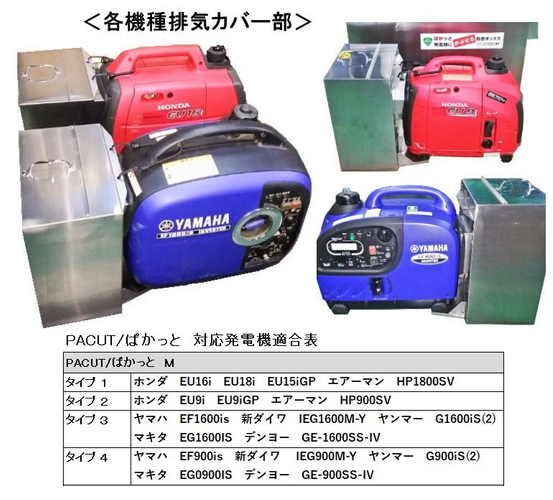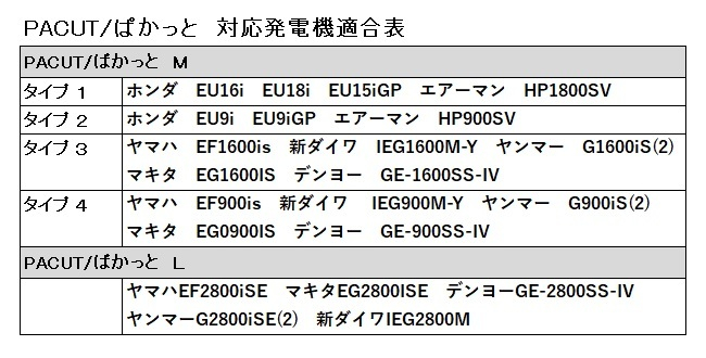 ぱかっと 使用可能発電機一覧(各種接続部が違い、共通ではありません)