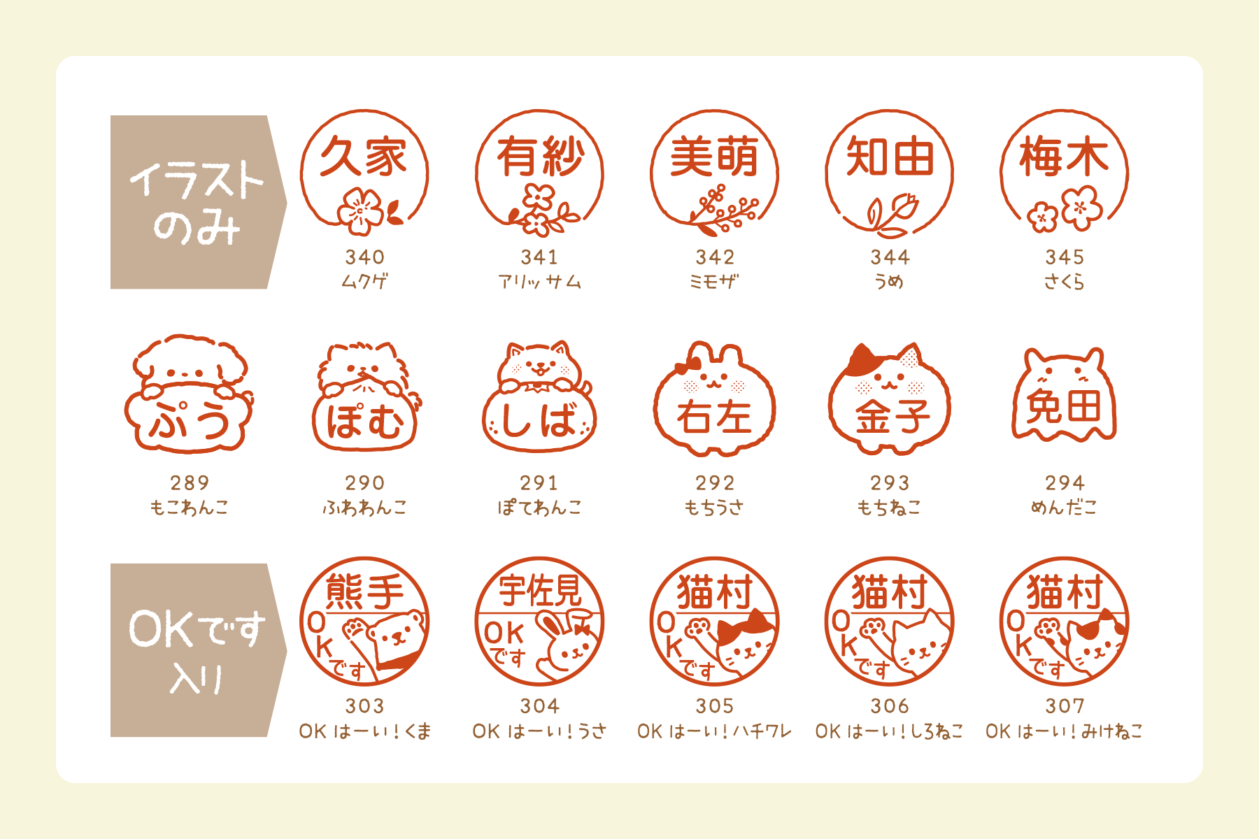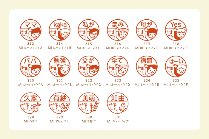 動物たちが元気よく手を挙げたポーズが印象的な「はーい!」シリーズは、「OKです」「みました」の文字がデフォルトで入っています。連絡帳や提出物の確認印として使いやすく、先生や保護者の方の“ひと目で伝わる”サインとして活躍します。かわいさと実用性を兼ね備えた人気シリーズです。