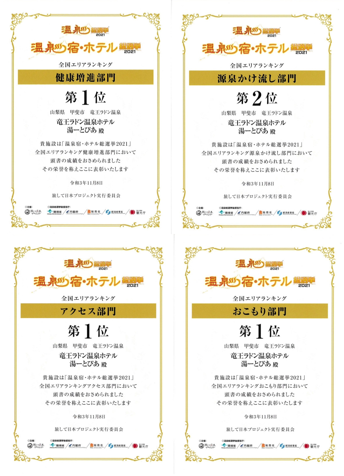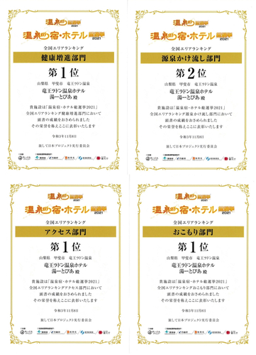 株式会社湯ーとぴあ(所在地:山梨県甲斐市 代表:早川 善輝)が運営する「竜王ラドン温泉湯ーとぴあ」は、全国の温泉宿ホテルの人気投票「温泉宿・ホテル総選挙」で「健康増進部門」「アクセス部門」「おこもり部門」の3部門で1位、「源泉かけ流し部門」で2位を獲得いたしました。また「ニフティ温泉ランキング2021」に於いても「北陸・甲信越エリアランキング1位」「山梨県ランキング1位」となりました。このたびの受賞を記念し、1月20日(木)より期間限定で通常6回4,200円(税込)の回数券を3,000円(税込)で販売する「温泉旅しよう500円キャンペーン」を実施いたします。