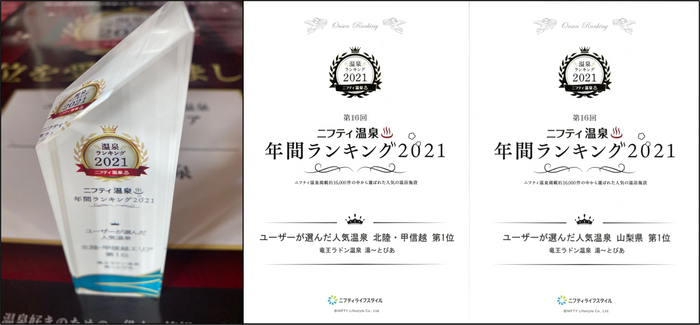 「ニフティ温泉ランキング」は2021年で16年目を迎えたランキングです。「ニフティ温泉」に掲載されている全国15,846件(2021年11月30日調べ)の温泉・温浴施設を、施設紹介ページの閲覧件数やクチコミ評価、クーポンの利用状況、ユーザー投票などの独自の視点からランキング形式で発表するとされています。2020年12月~2021年11月までの約1年をかけて検討の末、受賞が決定されました。