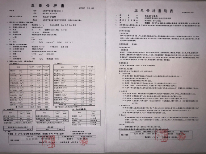 (源泉)竜王ラドン温泉は当敷地地下1,000メートルより湧き出る【含硫黄-ナトリウム-塩化物・炭酸水素塩泉】源泉100%かけ流しの温泉(療養泉)です。トリプル美肌効果のある美人の湯で、40度のぬる湯のため長湯が出来、体への負担が少ないです。重曹泉とも言われ、増富ラジウム温泉系天然ラドン含有温泉です。循環・加熱・加水一切無く、24時間地下より湧き出した温泉がそのままの状態で各浴槽へ大量に提供され、そのまま排水されていきます。