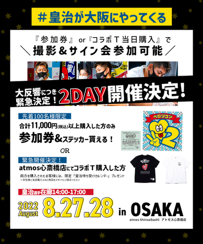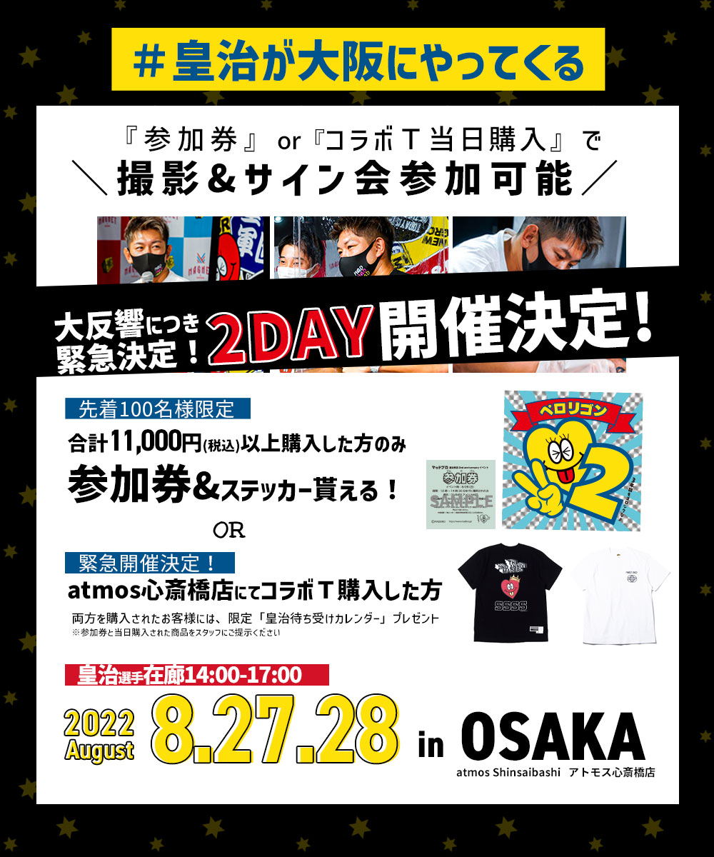 地元大阪のatmos心斎橋店に皇治選手本人も在廊し、購入者限定のファンとのミートアンドグリートも決定しています。